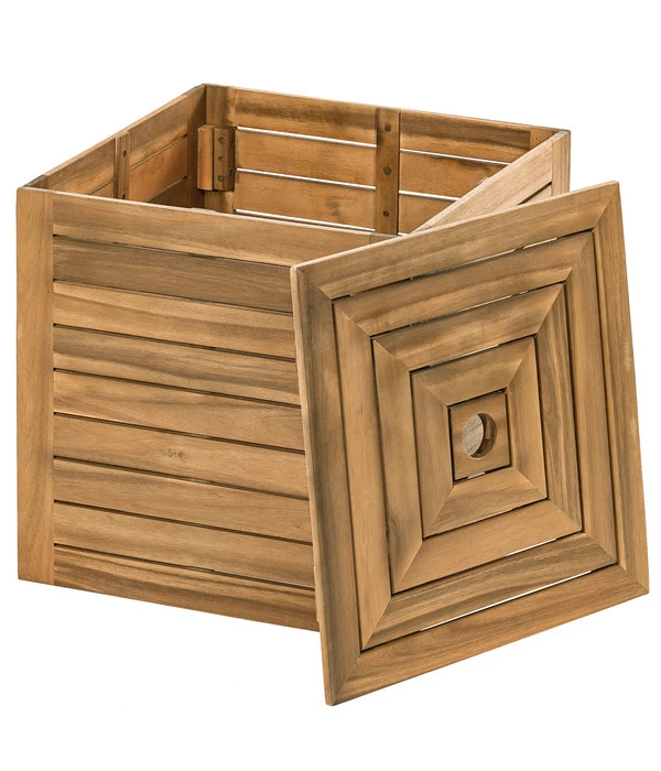 Gartenliebhaber und Outdoor-Fans wissen es zu schätzen, wenn der oft eher unschöne Schirmständer auf der Terrasse hinter einer stylischen Sonnenschirmbox elegant verborgen werden kann! Mit der Schirmbox Macao aus der Kollektion von Dehner erhalten Sie ein äußerst schickes Multitalent, das sowohl den Ständer Ihres Gartenschirms verdeckt als auch zusätzlich als praktische Ablage für Gläser und Flaschen genutzt werden kann. Auch das Innere der Kiste können Sie zur Aufbewahrung verschiedener Dinge wie für die Abdeckungen Ihrer Gartenmöbel verwenden. Zudem sorgt die aus Holz gefertigte Box für ein gemütliches und ausgesprochen dekoratives Ambiente auf Ihrer Terrasse oder im angrenzenden Pool-Bereich.