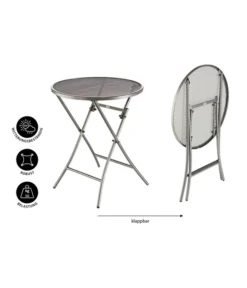 Stellen Sie sich vor, Sie kommen abends von der Arbeit nach Hause und können in den letzten Sonnenstrahlen des Tages in Ruhe einen Kaffee auf Ihrem Balkon oder in Ihrem Garten genießen. Der MWH Klapptisch Cafe Latte, eisengrau, rund, Ø 60 cm wartet schon auf Sie. Im Nu ist der Tisch aufgeklappt und der gemütliche Teil des Tages kann beginnen. Er bietet genug Platz, damit sich auch Ihre Partnerin oder Ihr Partner sowie Ihre Freunde zu Ihnen gesellen können. Sollten Sie den Tisch einmal im Regen stehen lassen, brauchen Sie sich auch keine Sorgen zu machen. Weder Wind noch Wetter können ihm etwas anhaben, sodass Sie an diesem Produkt sicher jahrelang Ihre Freude haben werden.